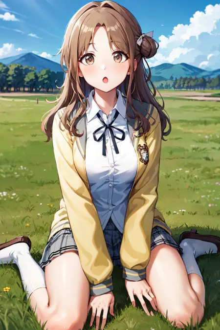 아웃핏1hmhinana, long hair, single side bun, hair ribbon, neck ribbon, school uniform, white shirt, yellow cardigan, open clothes, long sleeves, plaid skirt, grey skirt, pleated skirt