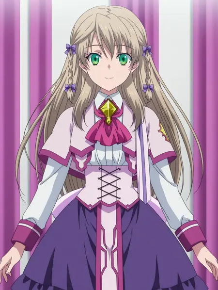 lora:Sion-ILXl-v1:1,long_hair,light_brown_hair,green_eyes,twin_braids,hair_ribbon,