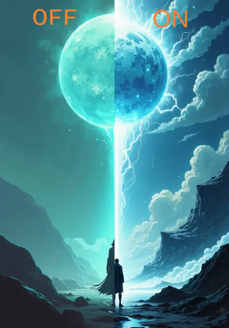 프롬프트: 스타일리시한 디지털 페인팅. 공중에 떠 있는 거대한 에너지 구체를 바라보며, 등 뒤를 지닌 긴 인물이 서 있다.