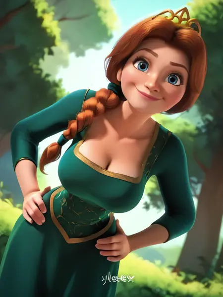 アクティベートワード「FionnaXLP」を使用してください。「茶色の髪、青い目、片側の編み髪、ティアラ、緑のドレス、胸元、そばかす」。さらに「Cartoon」を追加して改善してください。