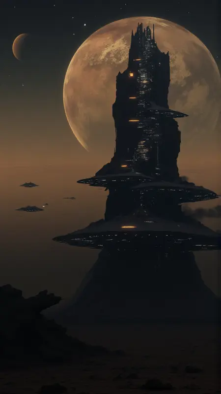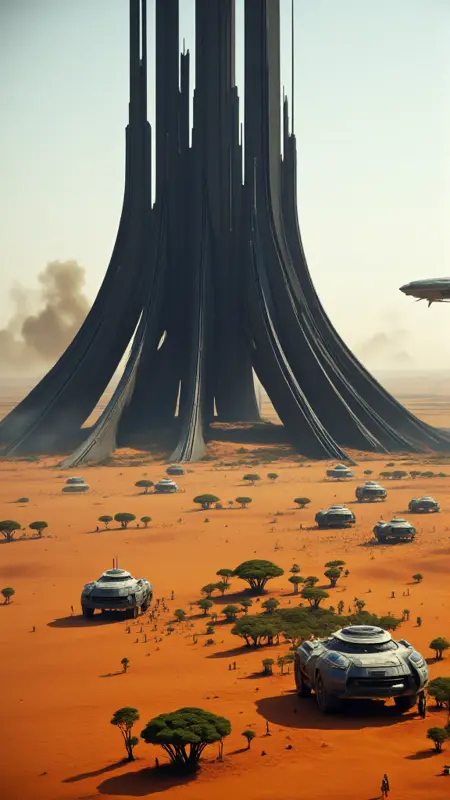 a futuristic landscape with a giant tower in the middle