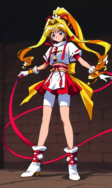 파손된 일반 복장: KKJs2, 아티스트 A 스타일, 보라색 눈, 이마 장신구, 얼굴 상처, 금발 머리, 매우 긴 머리, 드릴로 만든 긴 측면 머리카락, 뒤쪽에 한 개의 높은 드릴 페니테일, 흰색 팔각형 장식이 있는 빨간 머리 리본, 귀걸이, 파손된 복장, 흰색 경계선이 있는 빨간 안쪽 옷, 파손된 흰색 복장, 접힌 세로 칼라, 흰색 칼라, 흰색 옆 슬릿과 긴 셔츠 꼬리, 흰색 짧은 소매에 빨간 액센트, 왼쪽 소매 파손, 왼손에 노출된 짧은 빨간 안쪽 소매, 오른쪽 소매 파손, 오른손에 노출된 짧은 빨간 안쪽 소매, 노출된 팔 아래부분, 어깨 장식, 어깨에 빨간 리본 장식, 왼쪽 어깨 파손, 빨간 안쪽 옷 노출, 가슴에 십자가 장식, 금팔찌, 긴 흰장갑, 빨간 및 노랑 띠, 다리미 달린 빨간 로프, 큰 노랑 bows, 빨간 계층적 미니스커트, 흰색 자전거 반바지, 허벅지 커버, 자전거 반바지와 부츠 사이의 노출된 허벅지, 흰색 부츠, 부츠를 감싸는 빨간 십자형 리본