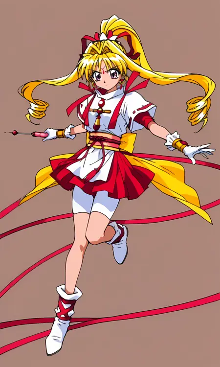일반 복장: KKJs2, 아티스트 A 스타일, 보라색 눈, 이마 장신구, 금발 머리, 매우 긴 머리, 드릴로 만든 긴 측면 머리카락, 뒤쪽에 한 개의 높은 드릴 페니테일, 흰색 팔각형 장식이 있는 빨간 머리 리본, 귀걸이, 흰색 경계선이 있는 빨간 안쪽 옷, 흰색 복장, 접힌 세로 칼라, 흰색 칼라, 흰색 옆 슬릿과 긴 셔츠 꼬리, 흰색 짧은 소매에 빨간 액센트, 짧은 빨간 안쪽 소매, 노출된 팔 아래부분, 어깨 장식, 어깨에 빨간 리본 장식, 가슴에 십자가 장식, 금팔찌, 긴 흰장갑, 빨간 및 노랑 띠, 다리미 달린 빨간 로프, 큰 노랑 bows, 빨간 계층적 미니스커트, 흰색 자전거 반바지, 허벅지 커버, 자전거 반바지와 부츠 사이의 노출된 허벅지, 흰색 부츠, 부츠를 감싸는 빨간 십자형 리본