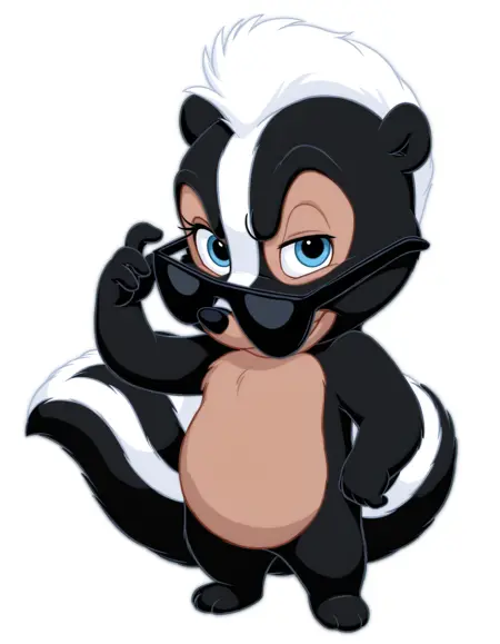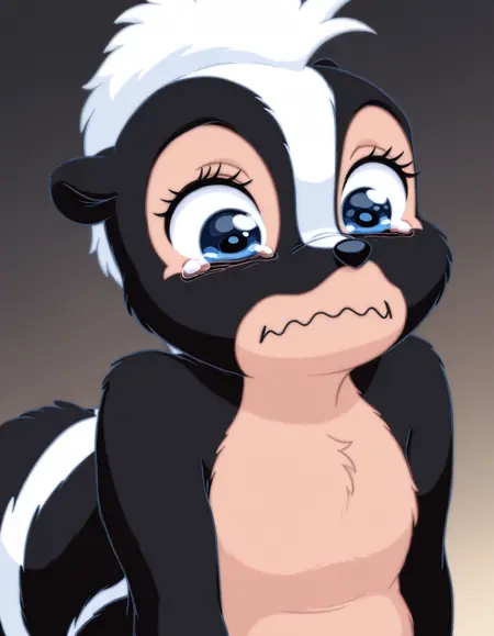プロンプト: masterpiece, best quality, cartoon, disney, girl, solo, f10wer, blue eyes, beige belly, black body, white stripe in face, black nose, beige face, black ears, white mohawk, skunk tail.