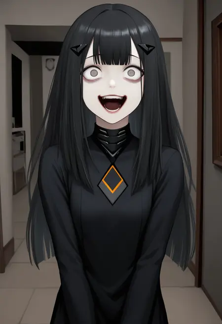 ボーナス!Gehennaガールの作り方:1girl, colored skin, white skin, white hair, side swept hair, long hair, colored sclera, black sclera, yellow eyes, black dress, black lips, black eyeshadow