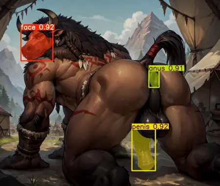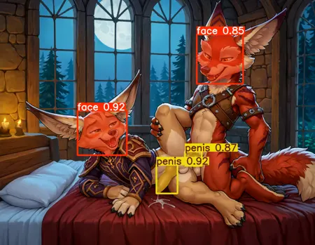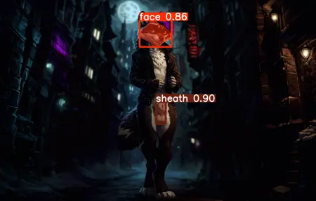Fdetailer は、YOLO をベースモデルとして、フューリーな解剖学に基づいて訓練されたインスタンスセグメンテーションモデルです。データセットは約2万枚の画像で、アンスロポモーフィック(人間型)およびフェラル(動物型)のキャラクターを含む、さまざまな種類とアートスタイルが含まれています。このモデルは、顔、陰茎、膣、肛門、阴囊、肉球を検出しマスク化することができます。珍しい種や奇妙な解剖学には若干苦戦するかもしれませんが、全体的に、私が初めてセグメンテーションモデルを訓練した成果としては驚異的な精度です。