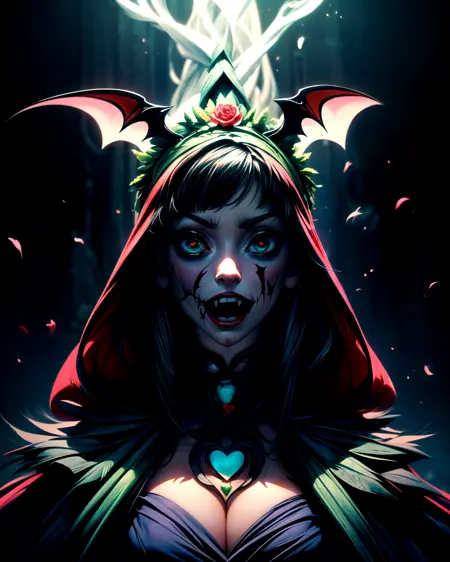portrait of Curiosity bat with bloodthirsty fangs terrifying howl, wearing emerald, fern, fuchsia, prophet flowing headdress, in sinister mist vampires ballroom with elegant waltz, impaled heart, scent of roses, ethereal aura ancient deity's idol