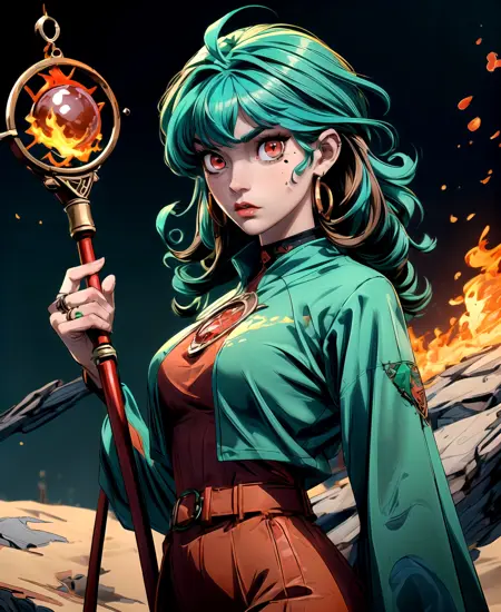 (extremely detailed 8k),(masterpiece),(best quality), Piratepunk ((Sea wanderer Ranger with Fiery Red eyes, Turquoise Long Ponytail hair, and Copper skin)). (Bushy eyebrows and Anchor tattoo). (Boho Anklet and holds a special Moonstone Mace), highly detailed, smooth and sharp outlines