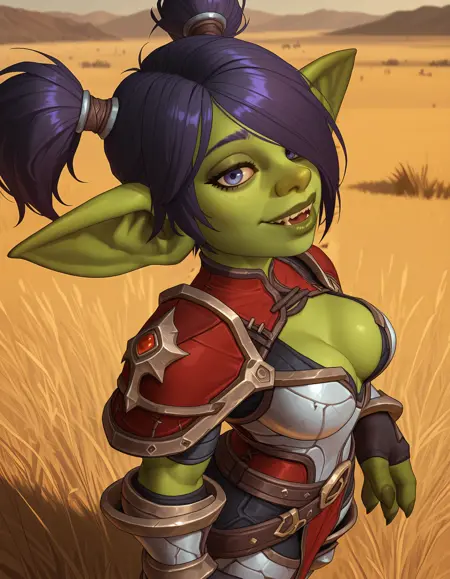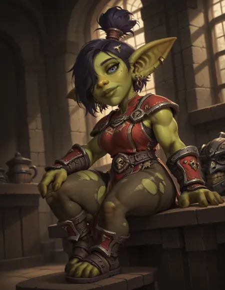 ワールドオブウォークラフト風の女性ゴブリン!ゲーム内のモデルから撮影されたさまざまなポーズ、ヘアスタイル、角度、撮影スタイル、そしていくつかの防具/服のセットをもとにトレーニングされています。