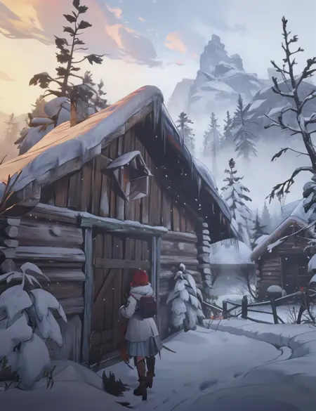 The area depicts a number of collapsed and dilapidated cabins buried in the snow. A frozen stream runs through the forest behind the town, and high rocky mountains ring the horizon. Trees in the area are thin, often broken, and beaten down by the harsh weather, lending further atmosphere to this inhospitable place.