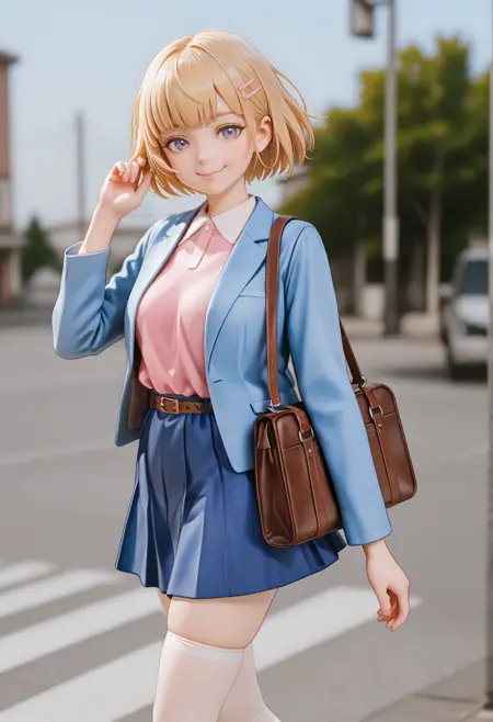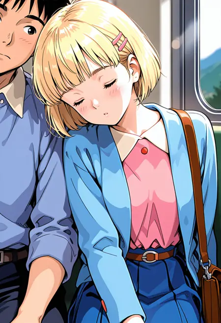 Trigger: "t0m0y0, short hair, blunt bangs, blonde hair, hairclip"