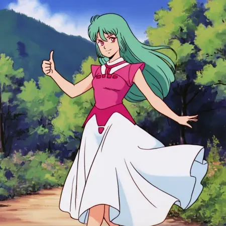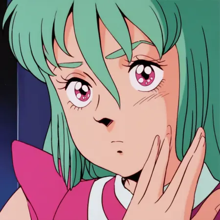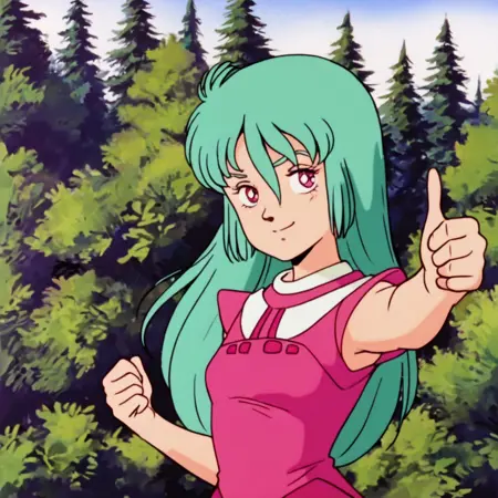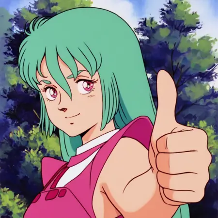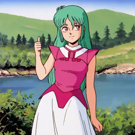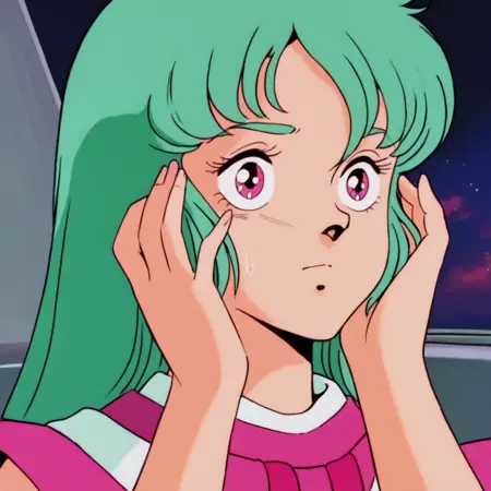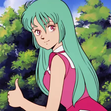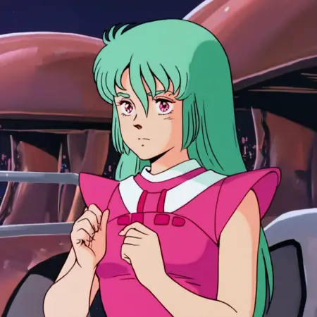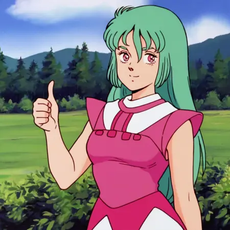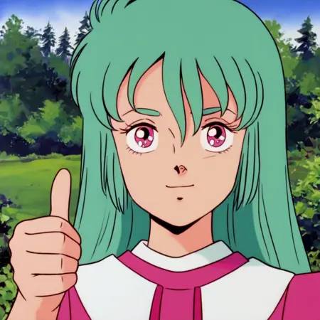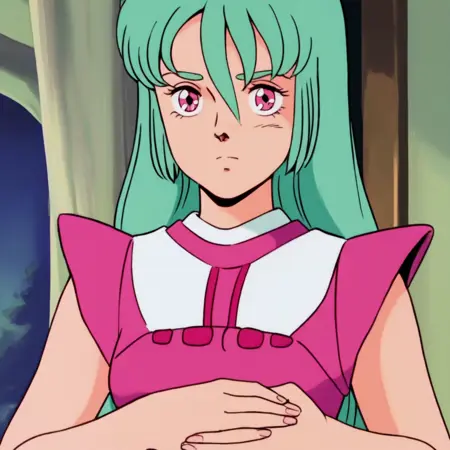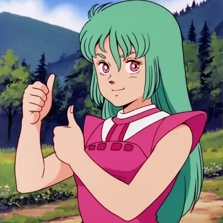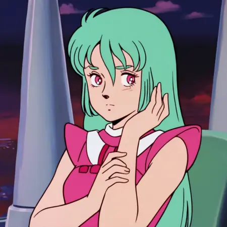 触发词: dunciel,1girl,solo,long hair,pink eyes,green hair,1980s (style), retro artstyle, anime coloring,