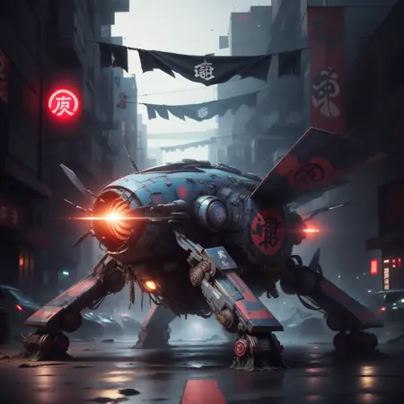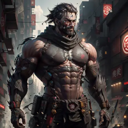 shinobi, bulky metal , (cyberpunk:1.1) , neon lights