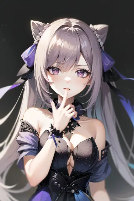 keqing (genshin impact), ハイツインテール, 紫髪, ツインテール, 紫目, 丸型の瞳孔, 髪飾り, コーン型ヘアピン, 長い髪, ダブルツインテール, ざね, バイオレットリボン, 髪飾り, 髪花, 髪リボン, [希望する衣装の詳細をここに記述してください......]