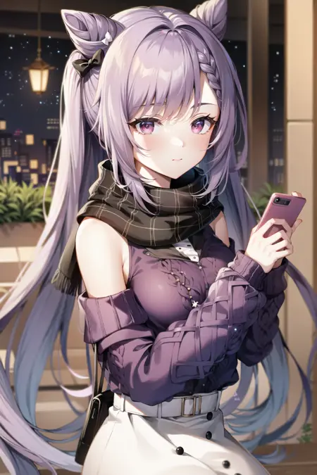 keqing (lantern rite) (genshin impact), keqing (genshin impact), ハイツインテール, スカート, マフラー, 紫のセーター, 白いスカート, 紫髪, セーター, ツインテール, 紫目, 丸型の瞳孔, 髪飾り, 肩出し, 笑顔, 胸, コーン型ヘアピン, 長い髪, ベルト, ダブルツインテール, 長い袖, ざね, バイオレットリボン, 髪飾り, ハーフリボン, ボウ, 髪花, 花リボン, プレートミスティー・マフラー, プレート, オフショルダー