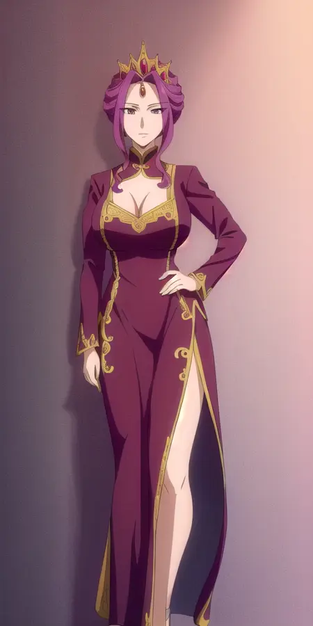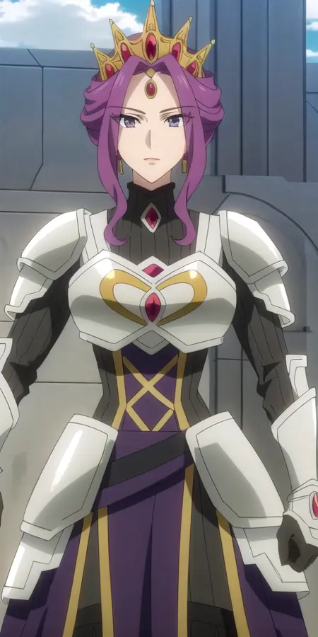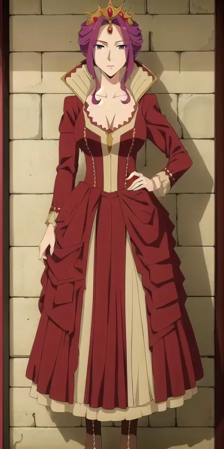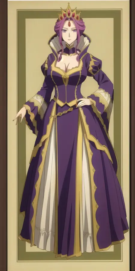 • Purple_royal_dress_Black_skirt_High_collar_Choker_Crown: 彼女のデフォルトのドレス