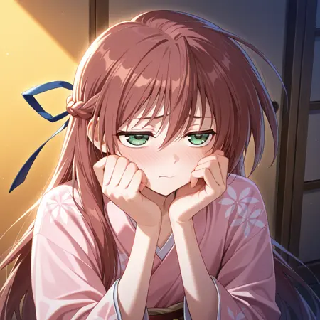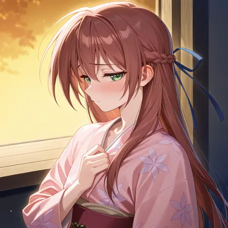 此时所穿的和服。腰带系得一丝不苟。虽非浴衣,但为避免与剑士服装重复,故设定为浴衣。少女感十足。
