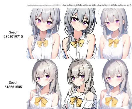 Kohaku_delta:针对Kohaku Delta特别训练,调整为5倍比例,推荐在Kohaku Delta上使用±2权重(在Animagine3.1中效果良好)
