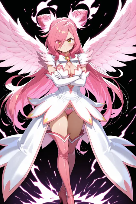 UltimateMagica: ultimatemagica, 흰 드레스, 가슴선, 짧은 소매, 흰 리본넥타이, 팬티, 팔꿈치 장갑, 흰 장갑, 천사 날개, 분홍 날개, 허벅지 부츠, 분홍 신발, 하이힐,