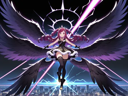 MagicaFallen: magicafallen, 할로, 왕관, 티아라, 초커, 검은 드레스, 하트 브로치, 어깨 노출, 소매 없음, 줄무늬, 검은 장갑, 모피 테두리 치마, 세로 줄무늬 허벅지양말, 검은 허벅지양말, 부츠, 검은 날개, 여러 개의 날개