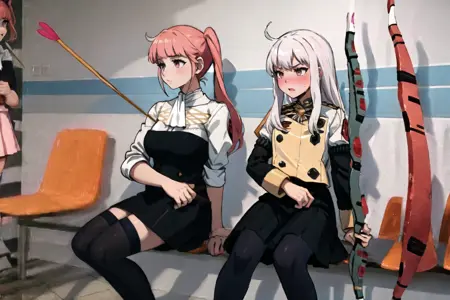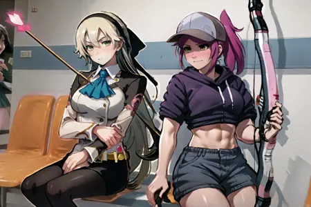 holding, bow (weapon), holding weapon, multiple girls/boys, 2girl/2boys