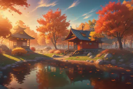 style of (hoppagames:1.0), (Award-winning photograph), (日本庭園), (秋の紅葉), (鮮やかな色), (落ち葉), (自然の美しさ), (赤と金色の調和), (紅葉の木), (水面への反映), (穏やかな静けさ), (伝統的な木造建築), (素朴な橋), (心地よい自然音), (季節の喜び), (穏やかな庭の景観), (低めの撮影角度), (自然光), (広角レンズによる風景描写), ヒドゥンオブジェクトゲーム, ビデオゲームコンセプトアート, (8K Unity壁紙), 細部の精巧さ, アワード受賞作品, 高度に詳細な描写, 16k, 映画的な視点, ((ビデオゲーム環境のコンセプトアートスタイル)), 美しい色調, 映画的な環境
