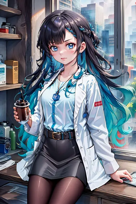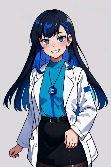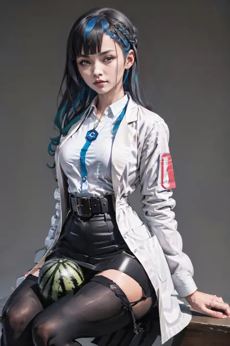 默认服装: 白大褂,衬衫,衬衫塞进裙子里,单条竖条纹,黑色裙子,铅笔裙,丝袜,项链,腰带