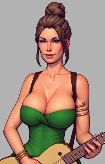 タグ:elizabethdarkwood_wb、ソロ、背の高い女性フータ、細長く鋭い顔、シャープで細い頬骨、細いウエスト、細い腕と脚、細身で背が高く、立ち姿、全身、黒い背景、ファンタジー吟遊詩人、緑のノースリーブドレス、高めのサイドスリット、白い下着が見える、手にギターを抱えて保持、アップドゥ・ビン髪型、ゴールドの腕輪、白い肌、大きな自然な胸、3/4ビュー、優雅な姿勢、ソフトなスタジオ照明、肩に革ひもで吊るしたリュートを保持。彼女はマンドリンカラーと高めのサイドスリットのある緑のノースリーブファンタジードレスを着ており、白いパンティが見える。髪は高めのレイヤードなビンにまとめられ、青い目、控えめな化粧、右腕にゴールドの腕輪を着用。大きな丸い胸がドレスを押しつぶし、片側が低く落ちて胸元を強調し、肌とリュートの木目には柔らかなハイライトが生まれる。フータ、陰茎を持つ女の子、長い四肢、囚人のように洗練された容姿、半閉じた目、細い唇、灰色の目、蒼白な肌、上部にビンを結んだボリュームのあるヘアスタイル、こめかみから肩へ垂れるカール、細い顔、高い頬骨、痩せ型、高い頬骨、高慢な表情、古代中世のリュート