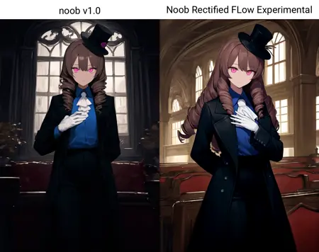 使用 NoobAI v-pred 1.0 作为基础模型进行微调,并默认通过转换为校正流(Rectified Flow)时,会使用 Anzhc 的 EQ-VAE-B7。本实验由于数据仍处于分布外,对暗场景处理困难,但证明了校正流确实是 SDXL 改进方向的下一步(超越单纯的 EQ-VAE)。该模型以某种方式从其固有的蓝移和蓝偏中恢复了 v-pred,但仍未改善无条件生成(uncond)部分,且需要修正“负向零化”(Zero Out negatives)问题——这些问题可在合适的微调中解决。