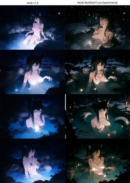 NoobAI v-pred 1.0을 기본으로 하여 Rectified Flow로 전환한 파인튜닝은 기본적으로 Anzhc의 EQ-VAE-B7을 사용합니다. 이 실험은 데이터가 여전히 분포 밖이기 때문에 어두운 장면에서 어려움을 겪지만, Rectified Flow가 SDXL 개선 노력의 다음 단계임을 보여줍니다(EQ-VAE 이상). 이 모델은 어떻게 든 내재된 청색 편향과 청색 이동에서 v-pred를 회복하지만, uncond에서는 여전히 개선이 부족하며, 적절한 파인튜닝을 통해 수정되어야 할 Zero Out negatives 문제를 겪고 있습니다.