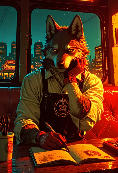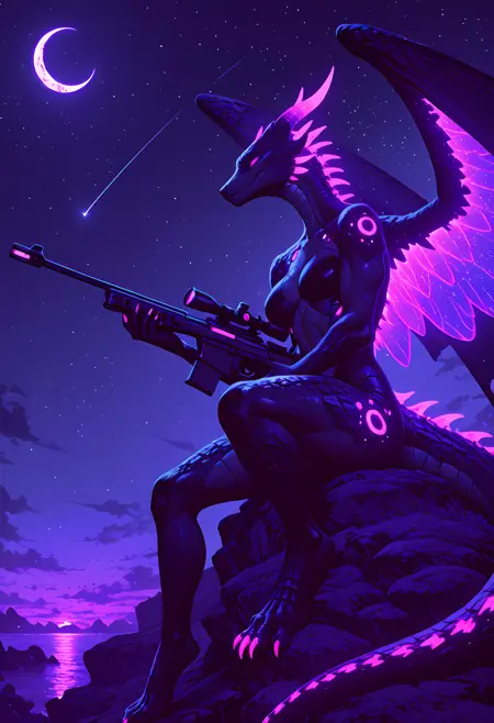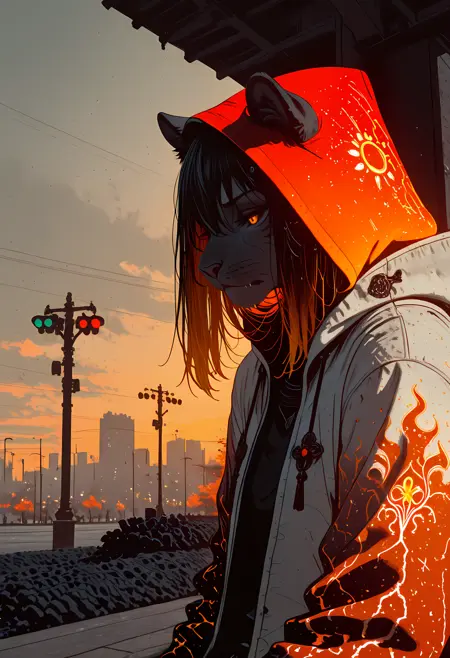 - シーン:暗い背景、ネオンのアンビエントライト、単一の光源、夕暮れの設定