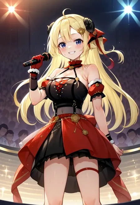 WatameIdol, long hair, ahoge, hair ornament, black dress, halterneck, puffy short sleeves, detached sleeves, bare shoulders, overskirt, red gloves, single glove, red thigh strap