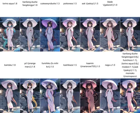 Given the short training period, some tags might not have been learned well. Through experimentation, increasing the "emphasis weight" to between 1.5 and 2.5 can still yield descent results, especially for character or artist tags.