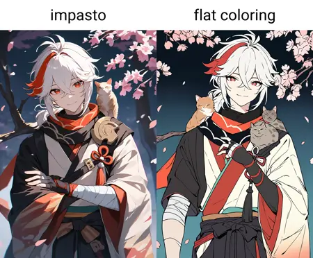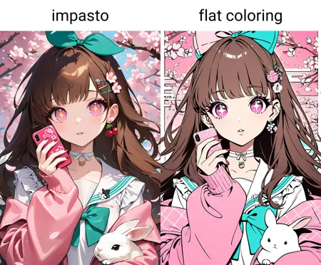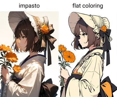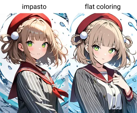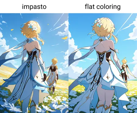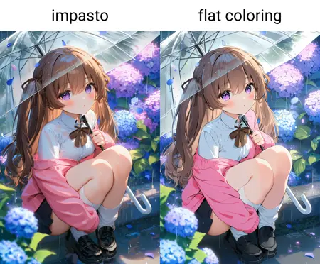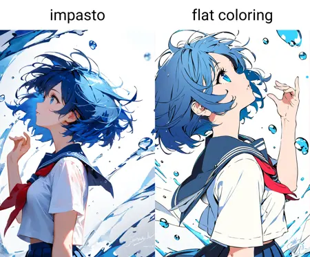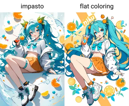 更新了训练集分开练进去了**厚涂(impasto)和平涂(flat coloring)**两种画风,同时基本没有污染琥珀佬Epsilon_rev1里的其他画风(其他画风词去琥珀佬模型介绍查 /model/399873/kohaku-xl-epsilon ),由于是基于琥珀佬Epsilon微调出来的模型保留了其内部3600个人物的数据,此模型在手部准确度上稍差,请您在使用时放弃掉那些写了一大堆质量词的tag,masterpice和best quality 已经足够了多写反而会增加炸图的概率,采样器推荐使用DPM++ 2M Karras,步数给到30即可,其他的大家自行体会吧!