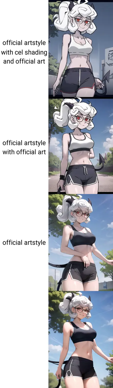 이 LORA는 기본적으로 전체 하레무를 포함하고 있으며, SFW와 NSFW 모두 가능합니다. 큰 장점 중 하나는 공식 아트스타일을 포함시켜 놓았다는 점입니다. 이 공식 아트스타일은 공식 아트와 공식 아트에 비슷한 이미지를 포함하고 있어, 언제든지 이를 호출하여 좀 더 게임스러운 분위기를 만들 수 있습니다. 이를 호출하려면 "공식 아트스타일 with (셀 쉐이딩) 및 공식 아트"를 추천합니다. 스타일 변화를 토큰 그라디언트와 함께 보여주기 위해 프롬프트 S/R 스위프트도 포함시켰습니다.