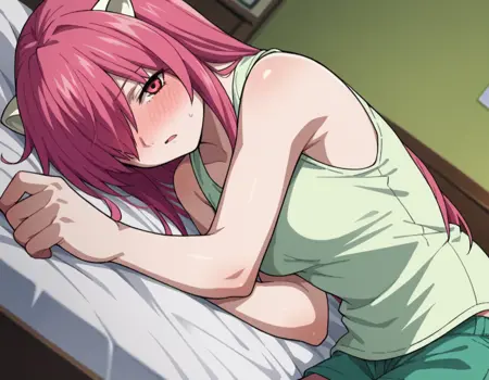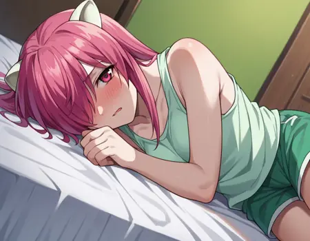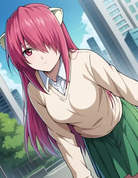 lucy, long hair, pink hair, horns, pink eyes, hair over one eye,