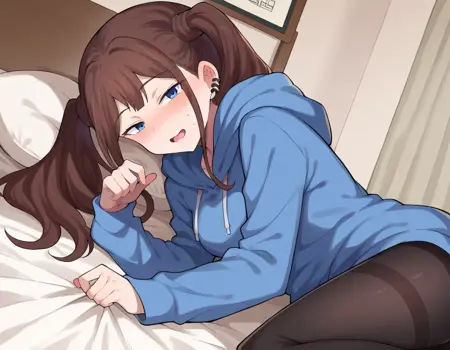 長袖, ジュエリー, パンティーストッキング, ピアス, フード, 黒いパンティーストッキング, フーディ, フードを下ろした, 耳のピアス, 時計, 青いフーディ,