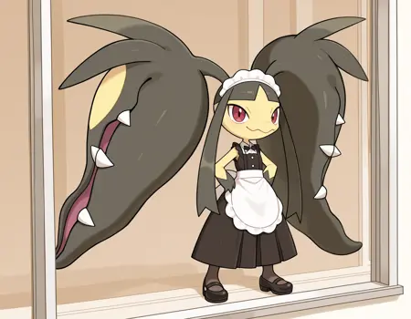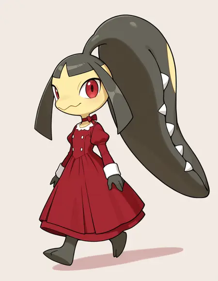 Mawile Tags: mawile, ponytail, long sidelocks, yellow skin, black hair, blunt bangs, pokemon \(creature\), red eyes, extra mouth