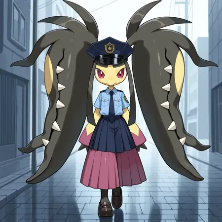 Mega Mawile Tags: mega mawile, twintails, very long sidelocks, yellow skin, black hair, blunt bangs, pokemon \(creature\), red eyes, extra mouth