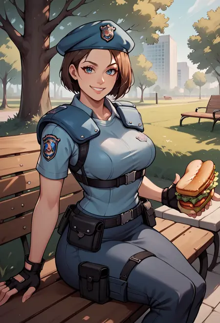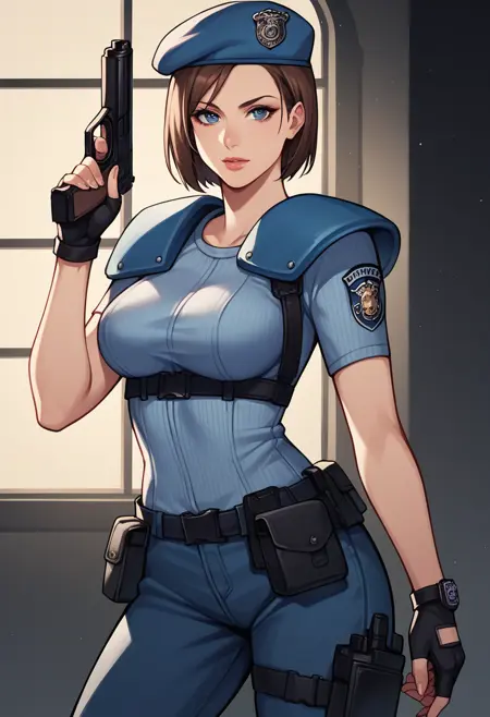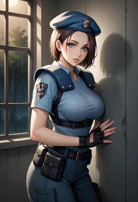 "JillSTARS, 갈색 머리, 밥컷, 짧은 머리, 베레모, 어깨 홀스터, 경찰 복장, 손가락 없음 장갑"은 STARS RE1 복장용.