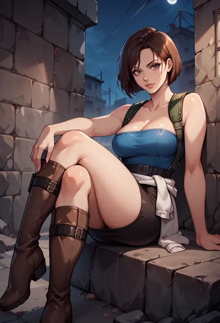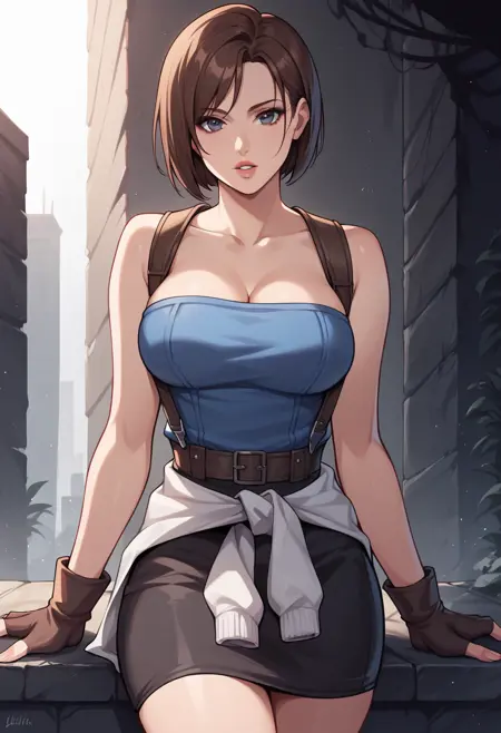 "JillRE3, 갈색 머리, 밥컷, 짧은 머리, 스트랩, 연필 스커트, 허리 주변의 옷, 부츠, 튜브 탑"은 RE3 기본 복장용.