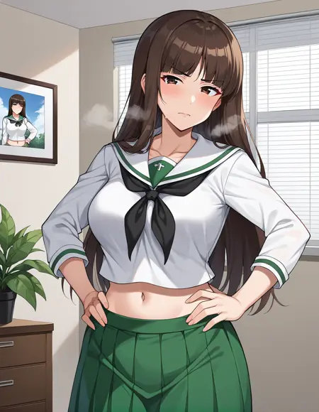 트리거 단어: nishizumi shiho, 1girl, mature female, blunt bangs, long hair, brown hair, straight hair, brown eyes