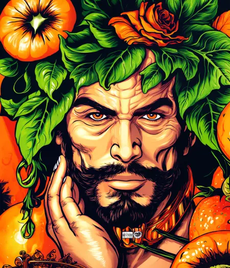 一张由水果构成的英俊男子肖像,风格参考吉塞佩·阿基姆波尔多与格雷格·鲁特科夫斯基、多纳托·吉安科拉、约瑟夫·克里斯蒂安·莱因德尔、WLOP、鲍里斯·瓦利乔,惊艳,8K分辨率,极致细节,美丽,开场镜头,艺术感,超写实,出众面容,Octane渲染,电影级光影,戏剧性灯光,矢量艺术风格的杰作