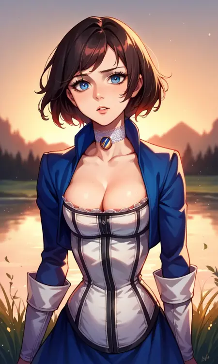 첫 번째 옷: "ELIZABETH1, 단발, 파란 눈, 짧은 재킷, 파란 드레스, 코르셋, 초커, 가슴 노출"