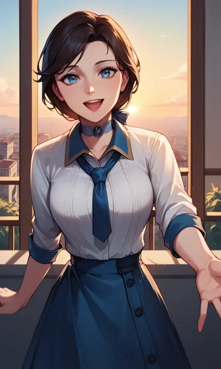 二番目の衣装: "ELIZABETH2, 低いポニーテール、ネクタイ、シャツの襟付き、白いシャツ、スカート、青い目"