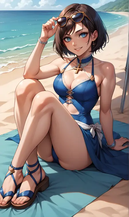 最初の衣装: "ELIZABETH1, 短髪、青い目、短めのジャケット、青いドレス、コルセット、チョーカー、胸元の強調"