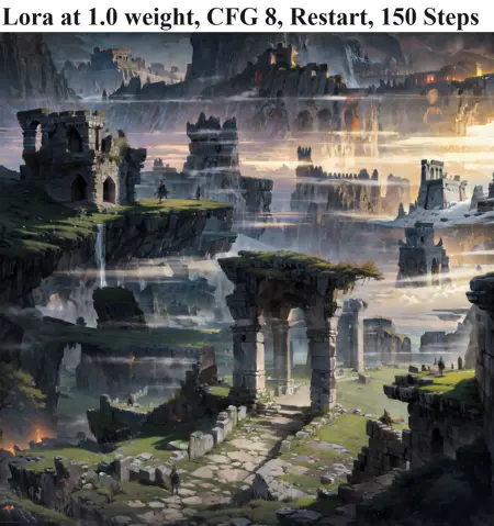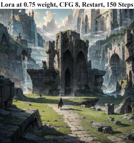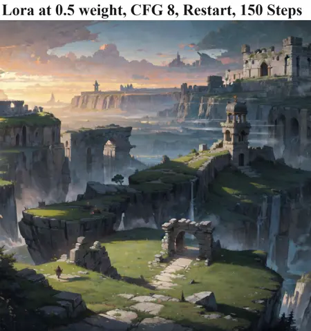 此LoRA旨在营造宏大、史诗般的风景画面,在生成大多数图像时带有奇幻风格。它与Landscape Photoreal检查点配合效果最佳,同时也与ClearVae兼容。这是1.0版本,我认为我还可以继续优化它,使其成为更通用、更写实但仍具史诗感的风景生成器。