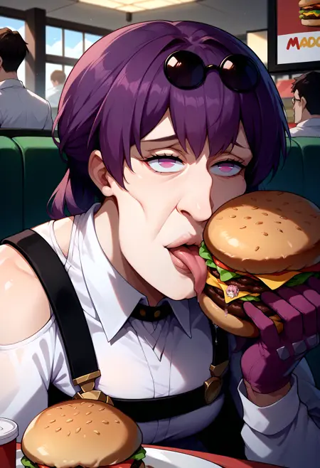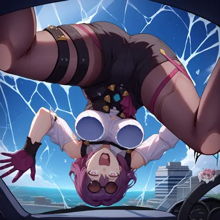 服装: 头戴眼镜,领衬衫,胸带,外套搭在肩上,紫色手套,高腰短裤,短裤下穿连裤袜,大腿绑带,长袖,不对称鞋履,单侧大腿靴,腿带,黑色靴子