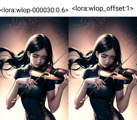 预览图片使用了 AnyLoRA 和 Abyss Orange Mix V2,偏移版本的权重为 1(旧版本为 0.6)。触发词当然是 wlop。也与 DreamShaper 搭配良好,但无法完全还原完美风格(因为它基于动漫模型训练)。我还使用了 CLIP 跳过 2。