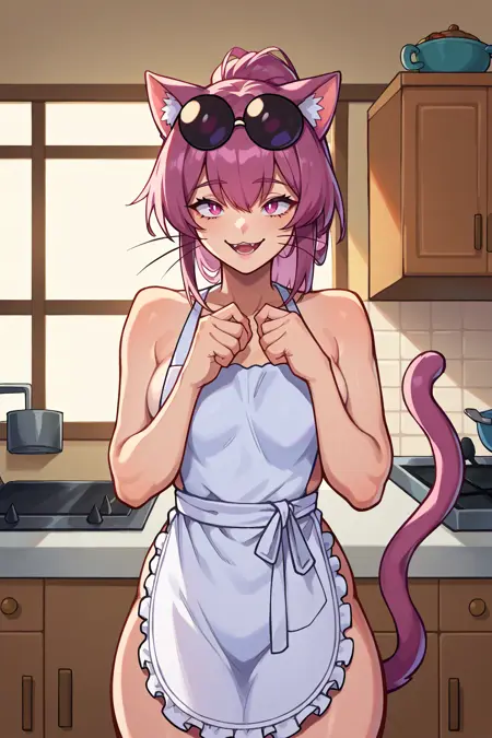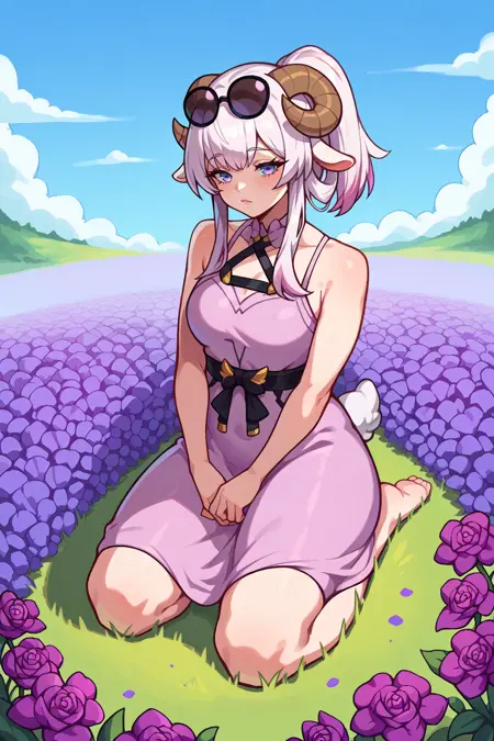 Appearance: NSKafkaMisc, long hair, bangs, sidelocks, ponytail + eyewear on head, sunglasses + purple eyes, purple hair, medium hair